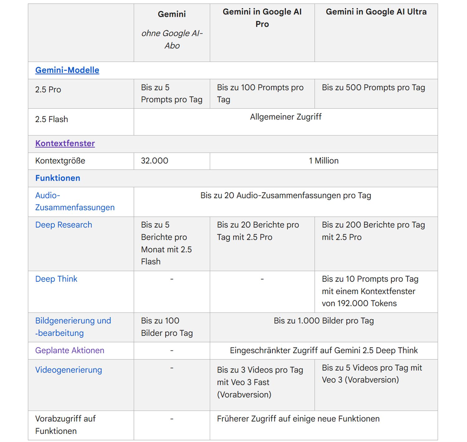 Die wichtigsten Limits sind es, dass ihr fünf Anfragen an Gemini 2.5 Pro per Tag richten könnt, wenn ihr kein kostenpflichtiges Abo habt. Ansonsten liegen die Limits bei bis zu 100 oder gar 500 Anfragen pro Tag (Pro/Ultra). Beim Flash-Modell, das standardmäßig zum Einsatz kommt, existiert gar kein Limit. Wer gar tiefe Recherchen erledigen möchte, ist auf fünf Berichte pro Monat limitiert oder auf 20 bis 200 je nach Modell.