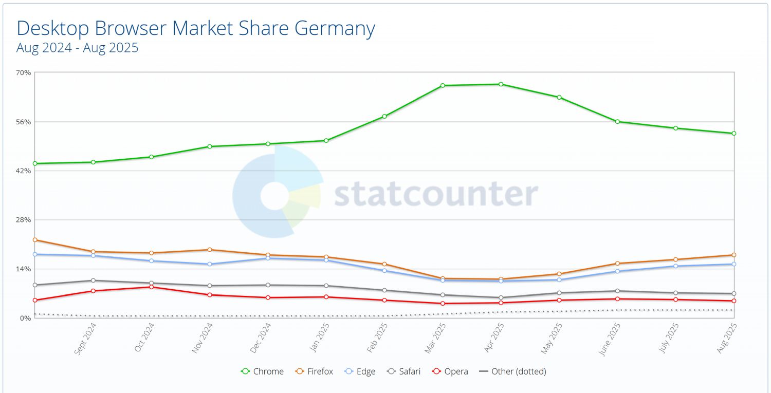 Schaut man sich das gesamte Diagramm an, kann man eher den Anfang von 2025 als Messfehler bezeichnen, während es sich jetzt wieder in die normalen Regionen über 40 Prozent einpendelt. Der damalige Aufschwung ging stark zulasten von Mozilla Firefox und Microsoft Edge, während die beiden jetzt wieder stark nach oben streben. Es ist nicht davon auszugehen, dass ganze 14 Prozent aller deutschen Internetnutzer innerhalb eines Jahres zwei Mal ihren Browser gewechselt haben.