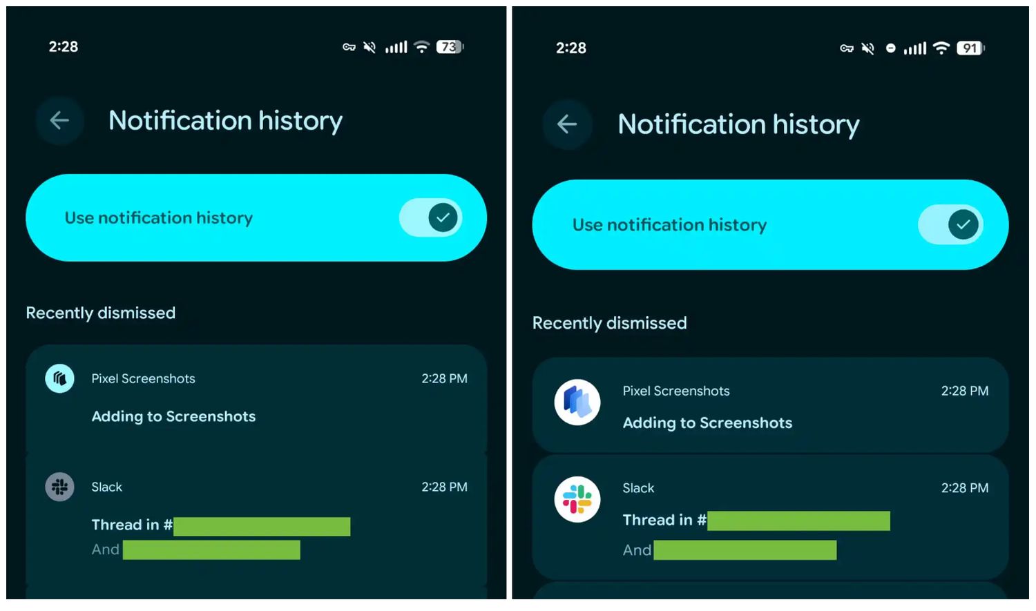 Der Benachrichtigungsverlauf mit der Auflistung aller bereits weggewischten Benachrichtigungen erhält ein neues Design, sodass die Einträge denen in der tatsächlichen Leiste deutlich ähnlicher sehen.