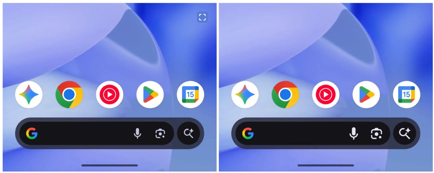 Die erste Neuerung findet sich schon auf der Startseite des Homescreens, denn es gibt eine Veränderung bei den Icons in der Suchleiste. Diese stechen jetzt farblich nicht mehr ganz so sehr hervor wie bisher, sind dafür aber etwas in der Größe gewachsen. Ihr könnt es an den Symbolen für die Sprachsuche, Google Lens sowie für die visuelle Gemini-Suche sehen. Das Google-G bleibt hingegen bei seiner bisherigen Größe und ist auch weiterhin mit Farbverlauf zu sehen.