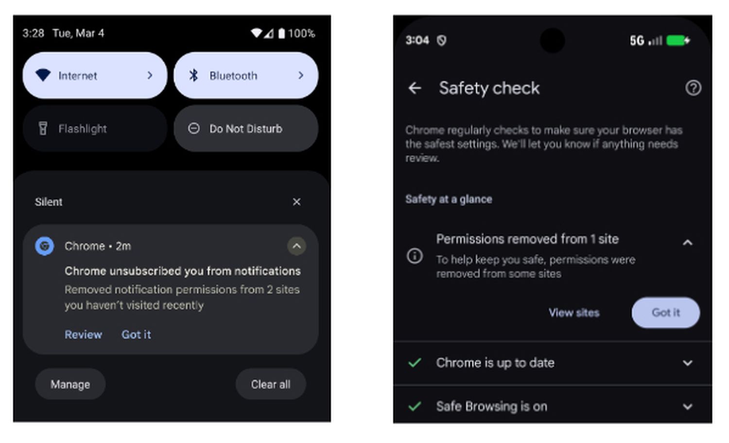 Auf Smartphones gibt es im Rahmen des Safety Check jetzt ein neues Feature, das automatisch im Hintergrund agiert und auch Benachrichtigungen regelmäßig säubern soll. Der Browser wird allen Webseiten mit wenigen Interaktionen und einem hohen Aufkommen an Benachrichtigungen die Berechtigung entziehen, Benachrichtigungen zu versenden. Wie hoch die entsprechenden Grenzwerte sind, hat man leider nicht bekanntgegeben.