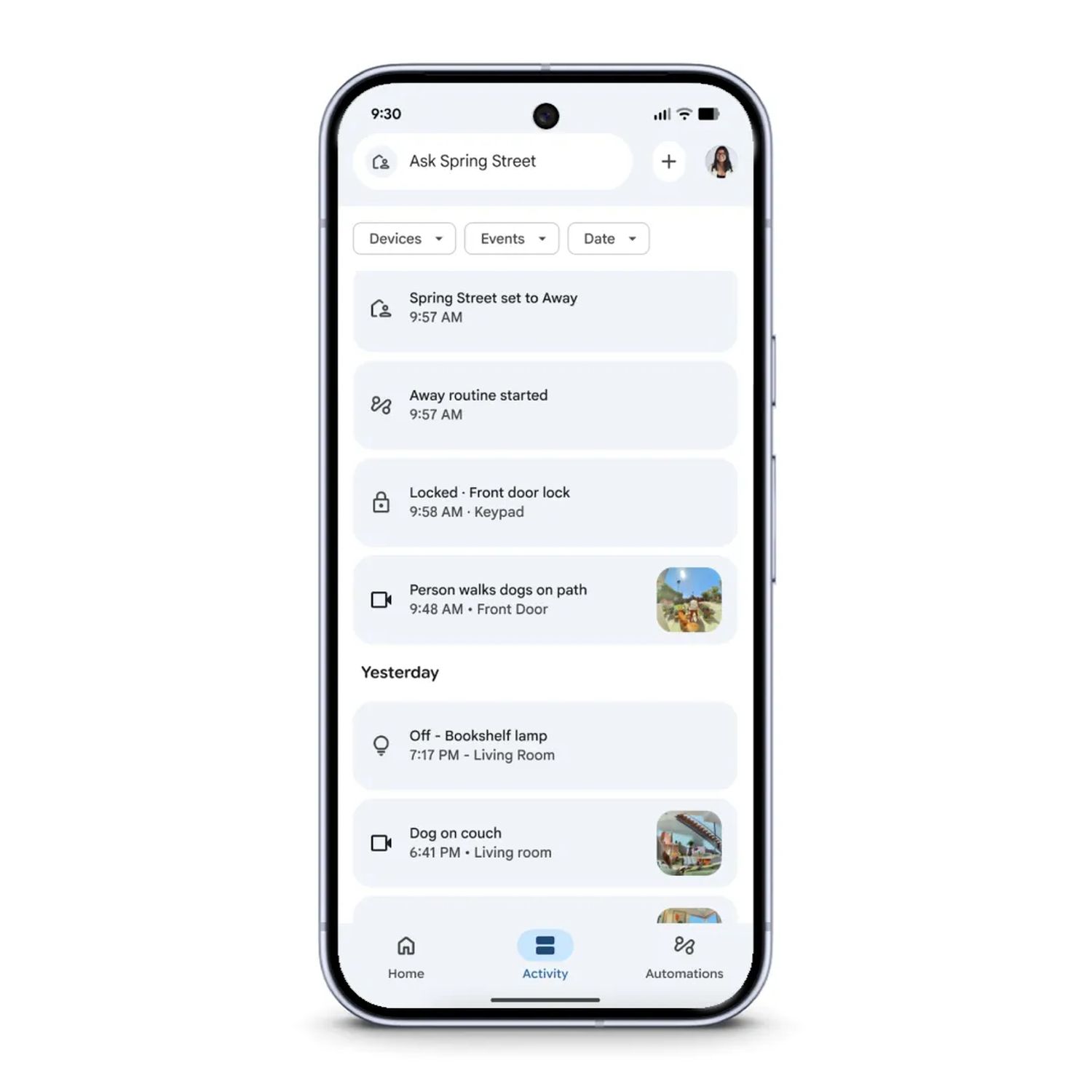 - Die Registerkarte „Aktivität“: Dies ist jetzt der zentrale Verlauf für alles, was in Ihrem Zuhause passiert, mit Ereignissen von allen verbundenen Geräten von Erst- und Drittanbietern. Hier finden Sie Home Brief*, um eine kurze Zusammenfassung Ihres Tages zu erhalten.