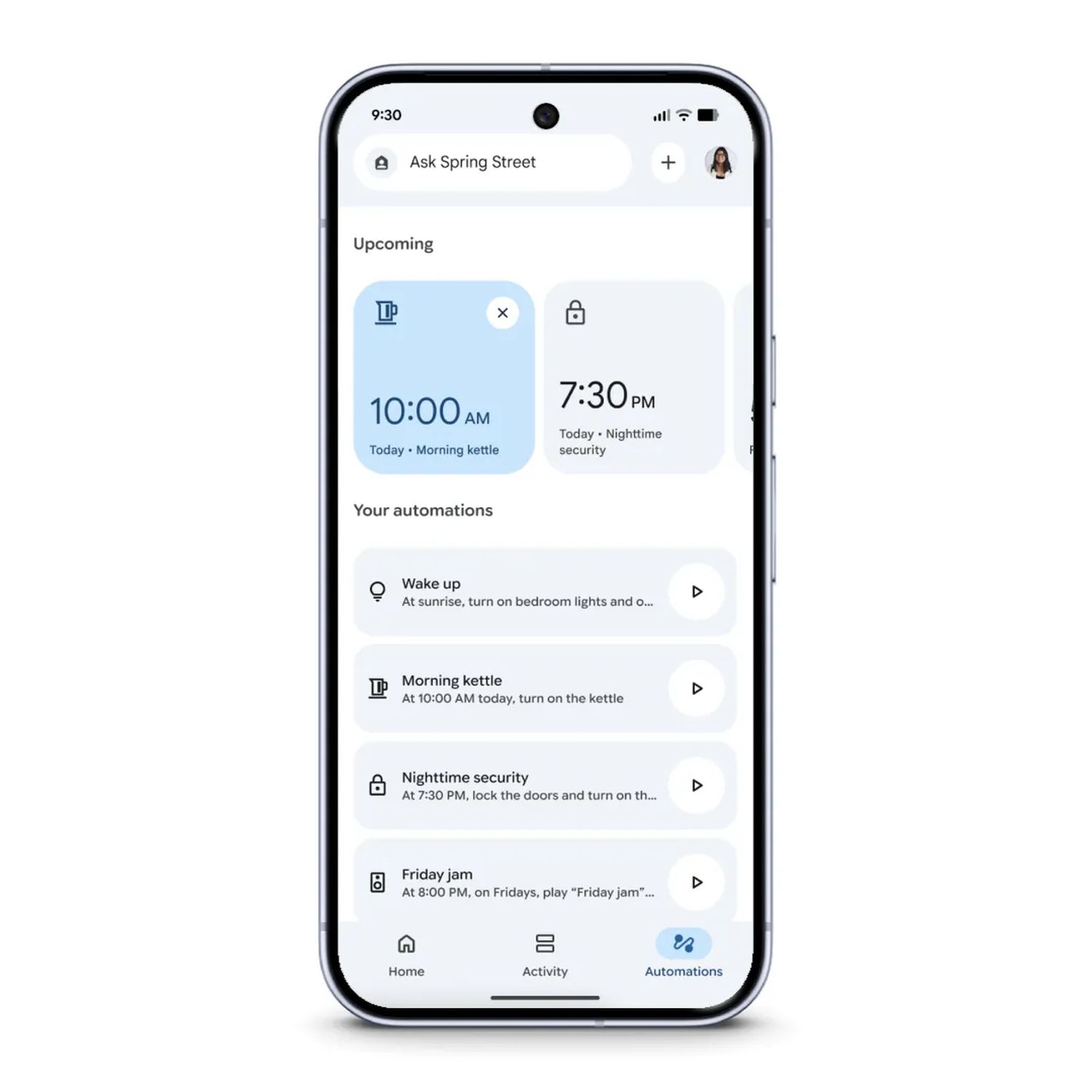 - Der Reiter „Automatisierungen“: Dieser Reiter verfügt jetzt über ein neues Karussell oben, das Ihnen die anstehenden Automatisierungen in Ihrem Zuhause anzeigt. Für alle, die tiefer einsteigen möchten, haben wir den Editor komplett neu entwickelt und bieten nun sowohl für iOS als auch für Android eine schnelle, native Erfahrung. Dies ermöglicht leistungsstarke Funktionen wie das Erstellen einmaliger Automatisierungen oder die Verwendung neuer bedingter Starter, sodass eine Routine nur ausgeführt wird, wenn jemand zu Hause ist.