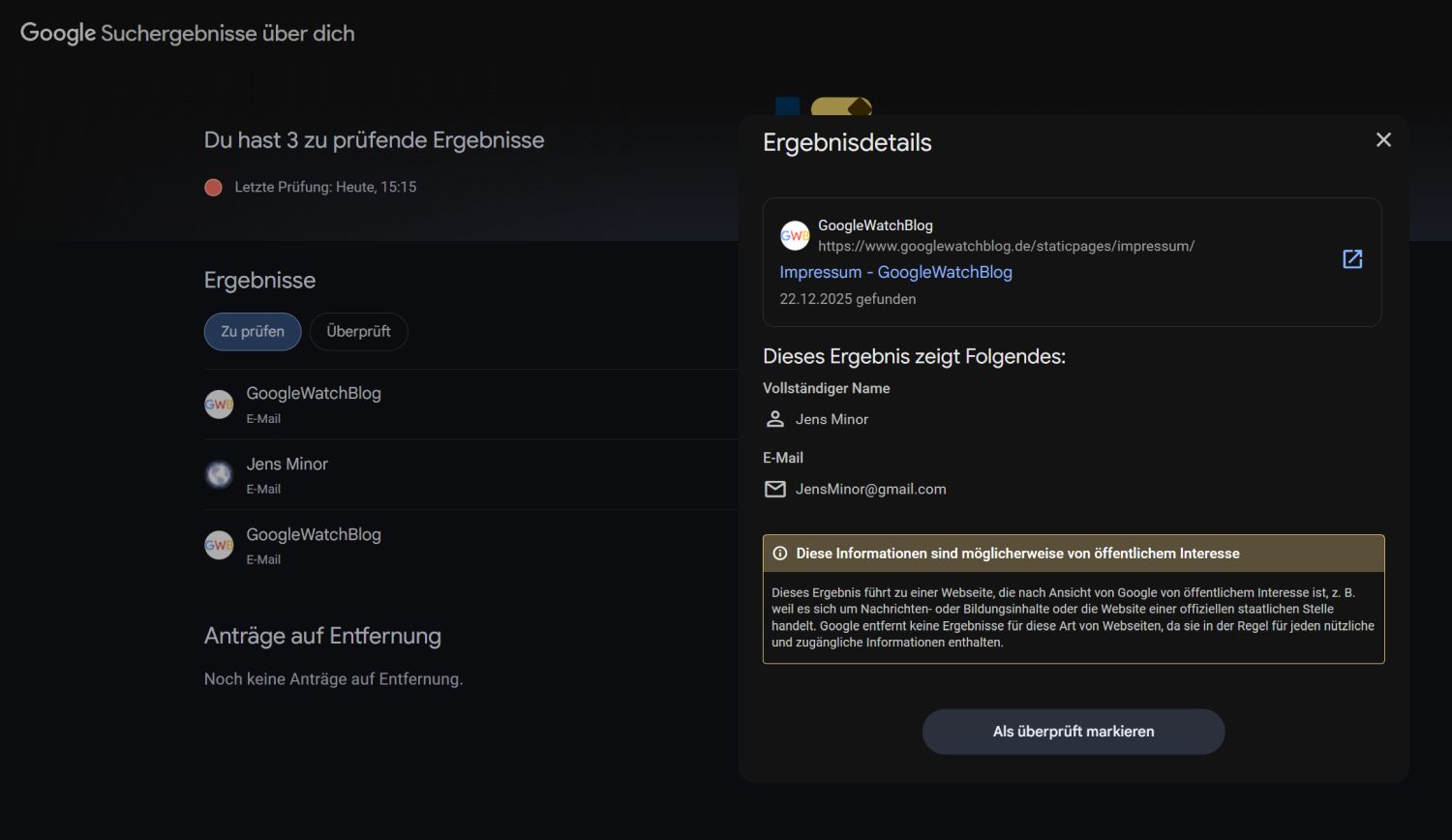 Sollte der Antrag erfolgreich sein, werden aber natürlich nicht die Inhalte aus dem Web entfernt – das liegt außerhalb von Googles Einflussbereich – sondern nur aus den Suchergebnissen. Für den Alltag sollte das ausreichen, wer sich aber wirklich vor professioneller Verfolgung schützen will, wird mit diesem Schritt nicht wirklich weit kommen. Dennoch, probiert das einfach einmal aus oder lasst das Tool dauerhaft aktiviert.