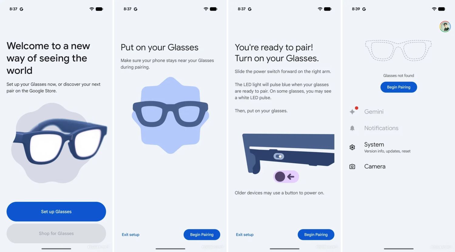 Zu guter Letzt ist noch die Startseite der App interessant. Denn dort finden sich nur die vier Bereiche Gemini, Benachrichtigungen, Systeminfos sowie Kamera. Das zeigt schon, wie relevant Gemini auf den neuen Brillen werden wird. Außerdem könnte sich wohl die Kamera der Smart Glasses vom Smartphone anzapfen lassen. Das ist im Detail aber noch nicht bekannt.