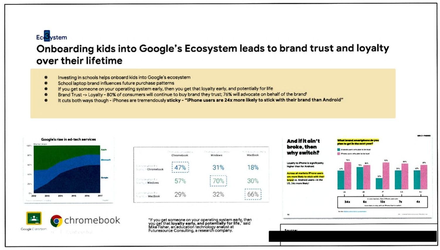 In geleakten Dokumenten zeigt sich jetzt, wie man das Chromebook-Geschäft Google-intern in den letzten Jahren eingeschätzt hat: Darin heißt es, dass man Kinder und Jugendliche als Nutzer/Kunden von Morgen gewinnen wollte. Wortwörtlich heißt es, „Kinder ins Google-Ökosystem einzuführen, sorgt für Markenvertrauen und lebenslange Loyalität“. Noch deutlicher heißt es, dass man eine „Pipeline für künftige Nutzer“ schaffen wolle.