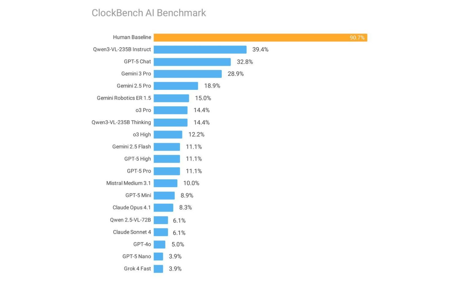 Der Klare Gewinner in diesem Test ist das KI-Modell Qwen3 mit einer Trefferquote von 39,4 Prozent. Das bedeutet, dass nur etwas mal als jeder dritte Versuch die korrekte Uhrzeit ergeben hat. Zum Vergleich: Beim Menschen liegt die Trefferquote bei etwa 91 Prozent. ChatGPT kommt in der fünften Generation auf 32,8 Prozent, Gemini in der aktuellen 3 Pro auf 28,9 Prozent und in der vorherigen 2.5 Pro auf nur 18,9 Prozent. Google hat zumindest einen sehr großen Sprung gemacht.