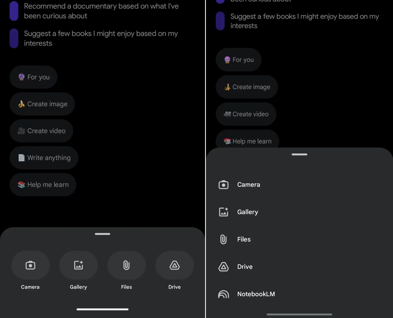Das jüngste Update für Gemini verändert das Auswahlmenü hinter dem PLUS-Symbol. Statt wie bisher auf die vier großen Icons zu setzen, gibt es jetzt wieder eine Liste inklusive deutlich kleinerer Icons. Das ist durch den Neuzugang notwendig geworden und könnte darauf hindeuten, dass vielleicht noch weitere Datentypen in Zukunft an dieser Stelle zur Auswahl stehen sollen.