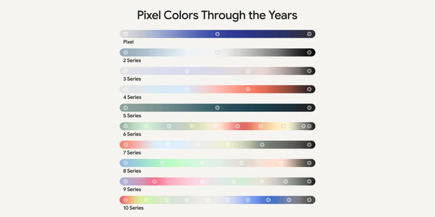 Obige Grafik zeigt, in welchen Farben die jeweilige Pixel-Generation zu haben gewesen ist. In den schicken Farbverläufen befinden sich Punkte, die für den exakten Farbton stehen, in denen die Geräte auf den Markt kamen. Wie ihr sehen könnt, hat sich nicht nur die Auswahl im Laufe der Jahre verändert, sondern auch die durch die Farben erzeugte Stimmung hat signifikante Änderungen durchlaufen.
