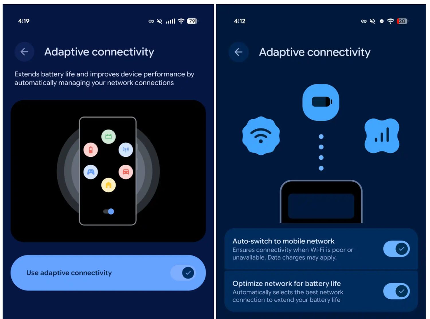 Statt wie bisher nur einen Schalter für die Aktivierung dieser Adaptivität zu haben (linker Screenshot), gibt es jetzt zwei Schalter, sodass die beiden Kernfunktionen separat aktiviert oder deaktiviert werden können. Mit dem Auto-Switch haben die Nutzer die Möglichkeit, Android automatisch auf die Datenverbindung wechseln zu lassen, wenn das WLAN-Signal zu schlecht ist. Das belastet zwar den Datentarif, schont aber den Akku und bringt noch dazu wieder eine stabile Verbindung.