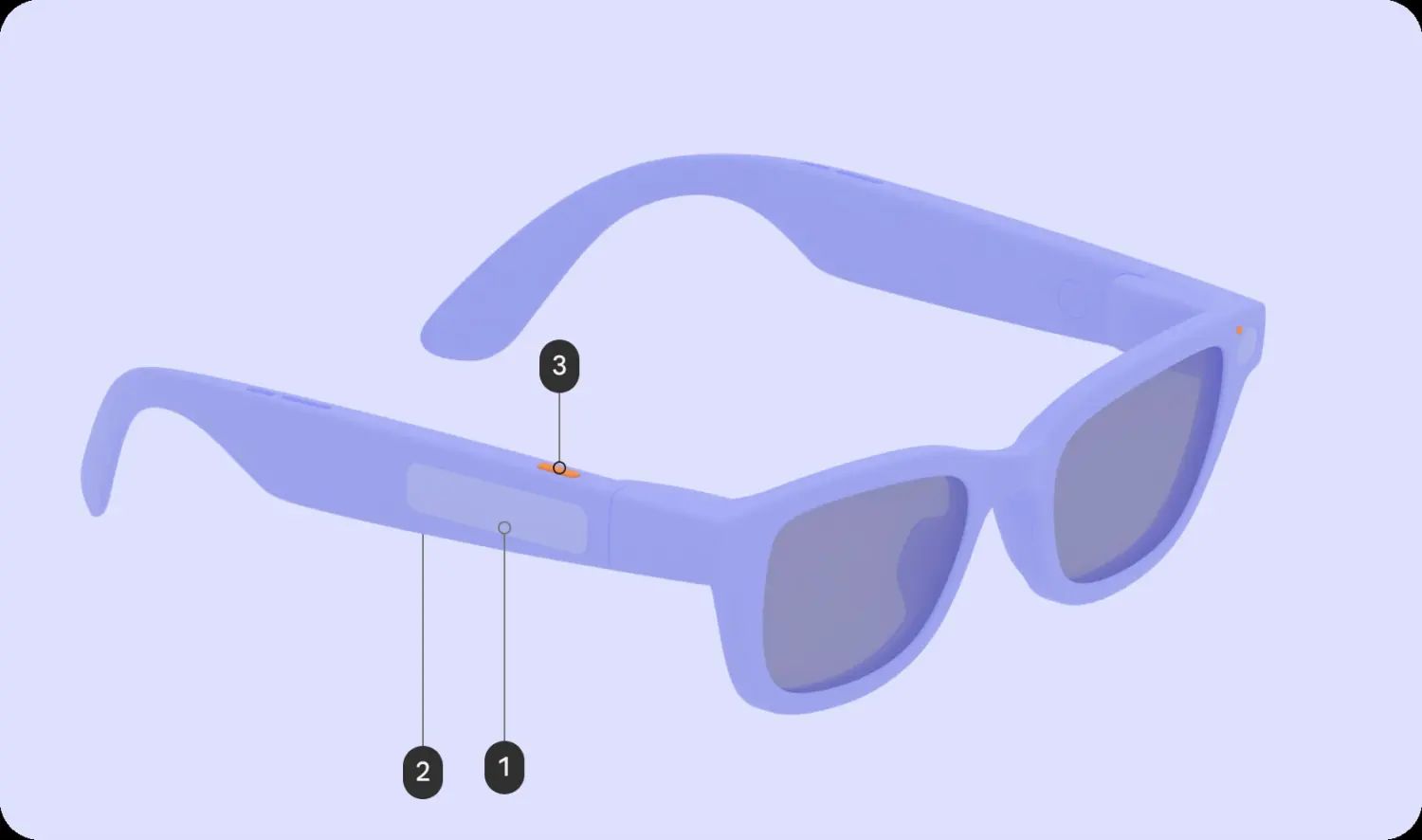 Für alle Smart Glasses gilt, dass sie im rechten Bügel eine Reihe von Bedienelementen besitzen müssen: Ein Touchpad an der Seite (1), einen Power-Button zum Einschalten und Ausschalten am unteren Rand (2) sowie einen Kamera-Button an der Oberseite des Bügels (3). Der Kamera-Button kann mit einem Klick ein Foto aufnehmen, mit einem langen Klick ein Video aufnehmen und mit einem Doppelklick auf den Displaygeräten die Kamera-App starten.