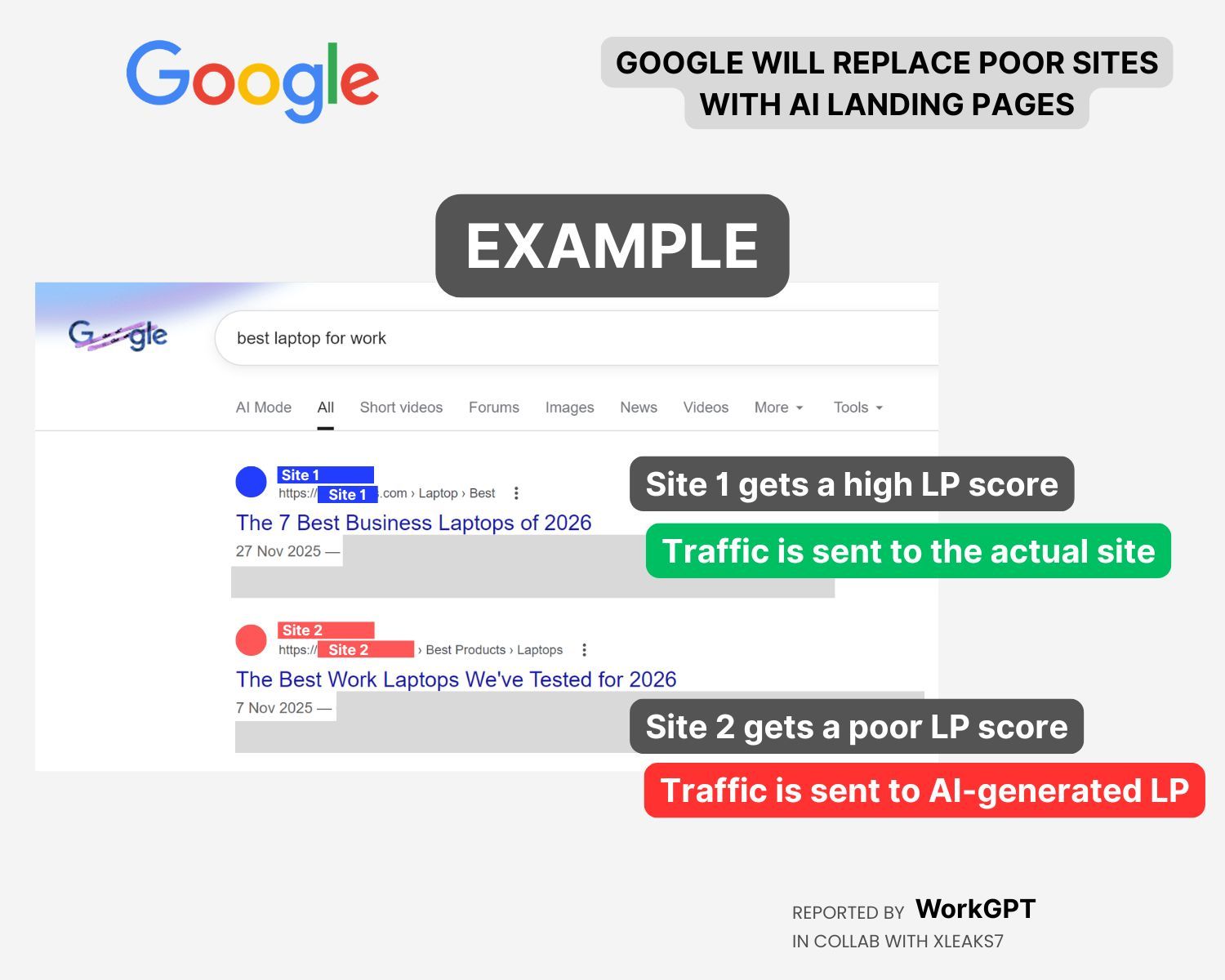 Wie jetzt aus einem neuen, von WorkGPT entdeckten, Patent hervorgeht, könnte man die Nutzer schon bald vollständig auf den eigenen Seiten binden – selbst dann, wenn sie ein Suchergebnis anklicken. Konkret wird ein Szenario beschrieben, bei dem die Google-Algorithmen eine Landingpage als qualitativ und technisch minderwertig betrachten und entsprechende Maßnahmen setzen. Statt die Nutzer auf ihren angeklickten Link weiterzuleiten, soll die KI zum Einsatz kommen.