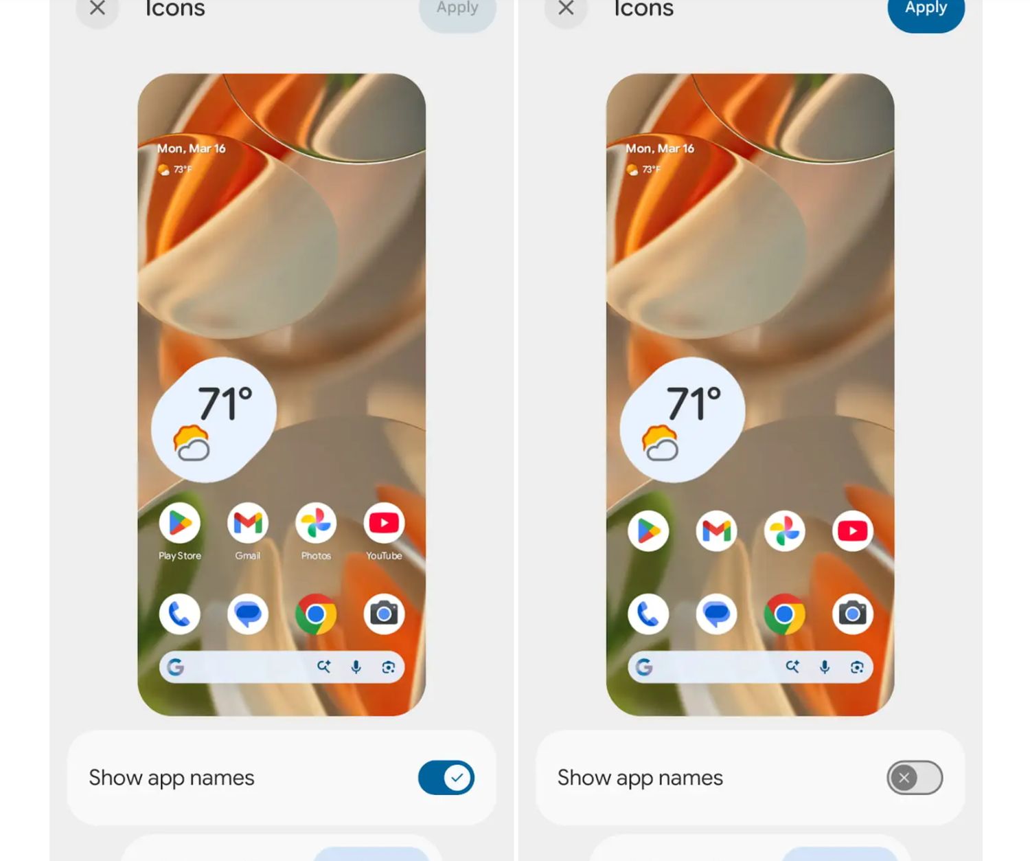 Android bietet nun eine Benutzereinstellung, um App-Namen (Bezeichnungen) auf dem Startbildschirm auszublenden. Diese Einstellung ist über die Systemanpassungs- und Hintergrundbildauswahleinstellungen zugänglich.