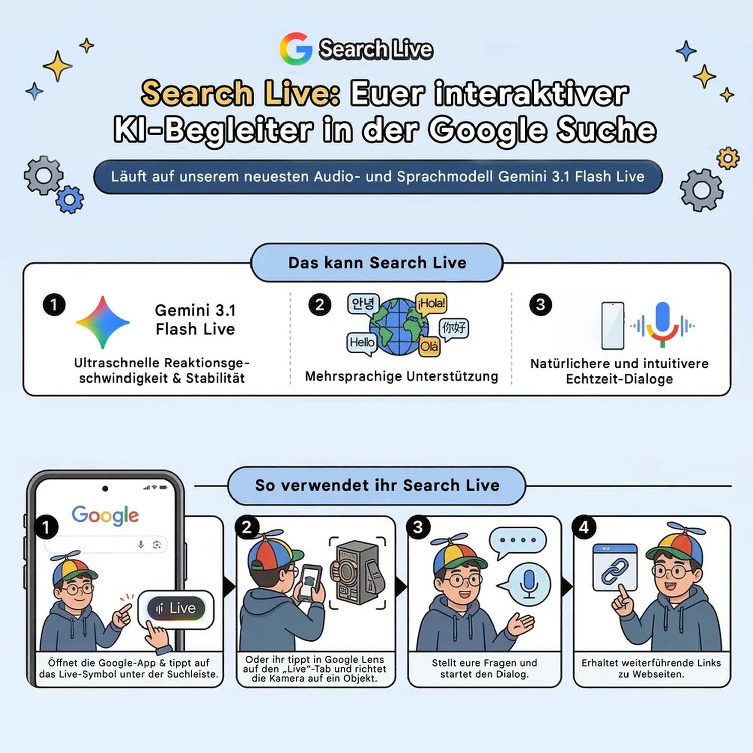 Die Erweiterung des KI-Modus basiert auf dem erst vor wenigen Wochen gestarteten Sprach- und Audiomodell Gemini 3.1 Flash Live, das mit diesem Tool Premiere feiert. Es ermöglicht natürlichere Dialoge als die Vorgänger und ist von Grund auf multilingual konzipiert. Das bedeutet, dass die Nutzer in ihrer bevorzugten Sprache sprechen können und die KI sich dementsprechend automatisch anpassen wird. Auch ein Sprachwechsel innerhalb einer Konversation ist möglich.