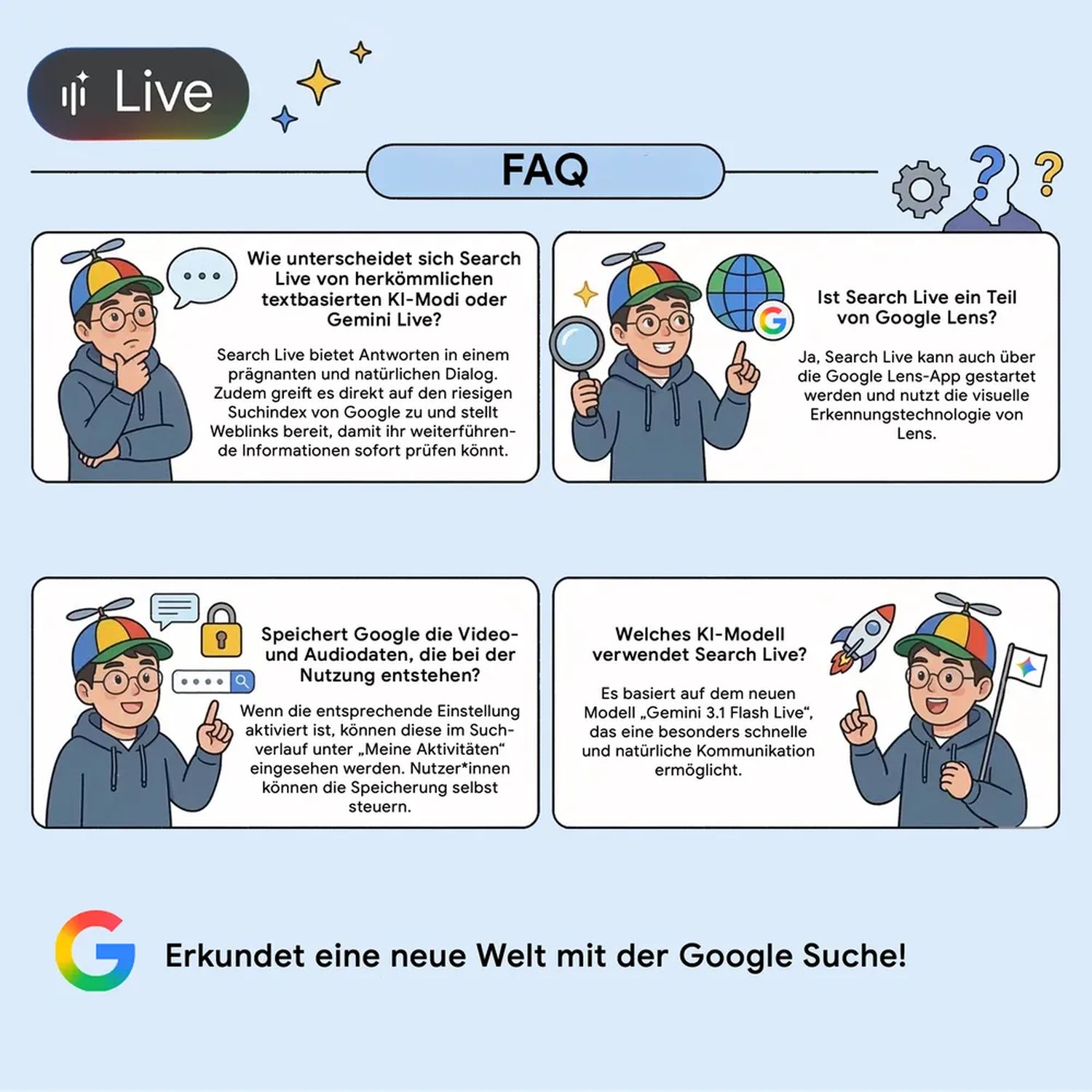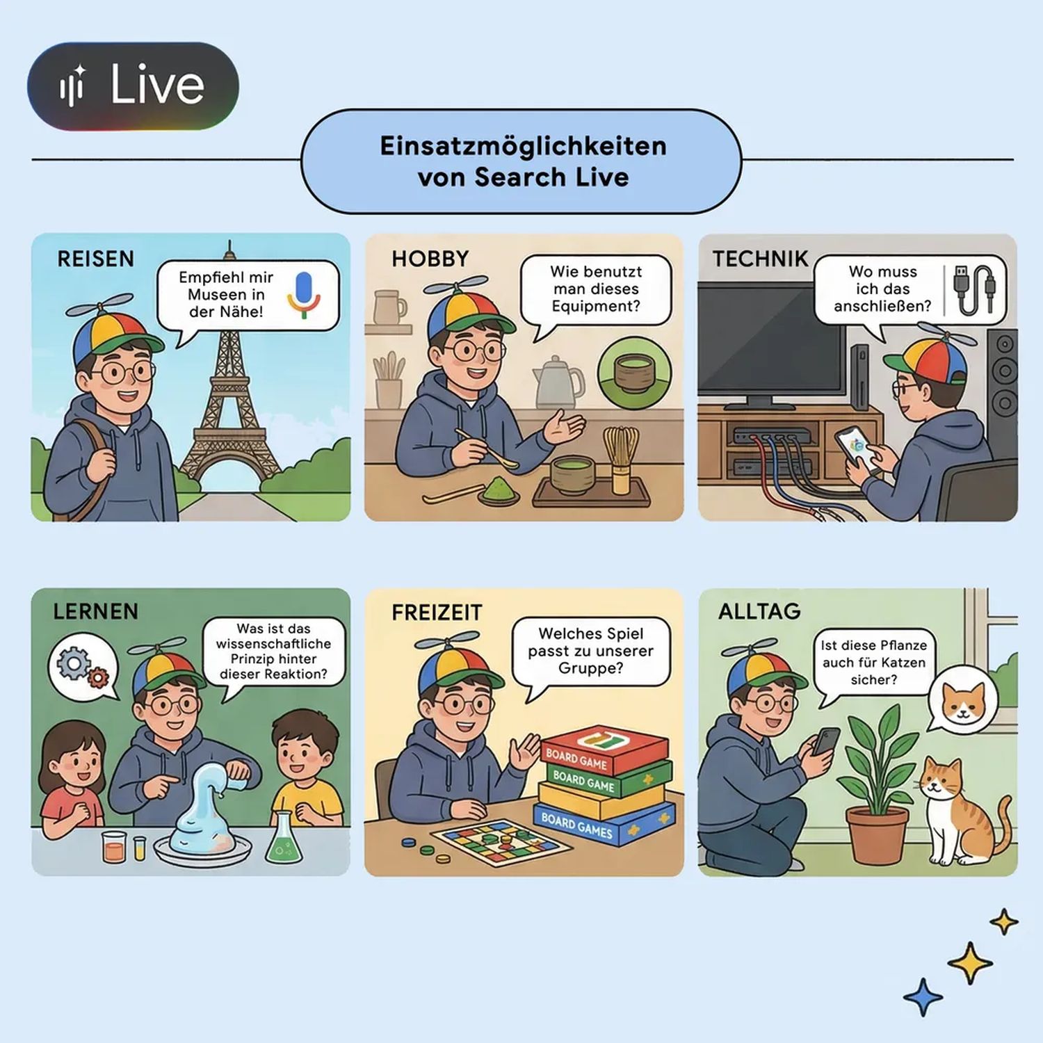 Search Live ist ein Bestandteil des KI-Modus der Google-Suche, kann aber auch aus Google Lens heraus gestartet werden. Wie das Ganze funktioniert, zeigt man jetzt mit einer gut gemachten Infografik. In dieser könnt ihr sehen, wofür sich der Modus verwenden lässt, wie sich der Modus starten lässt und in welchen Bereichen es verwendet werden kann. Die Anwendungsgebiete reichen von Reisen und Hobby über Technik und Lernen bis zu Freizeit und Alltag.