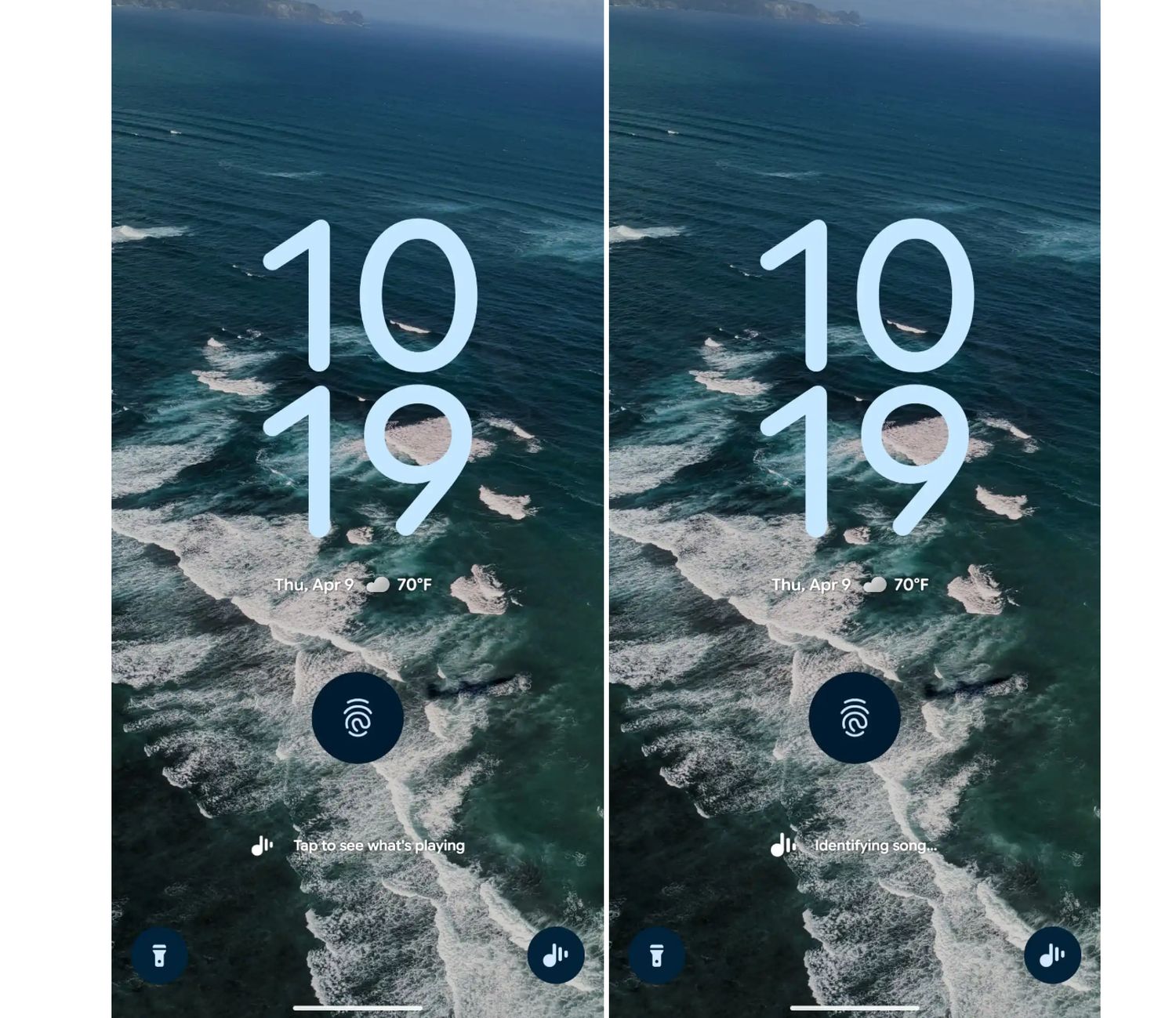 Jetzt gibt es ein weiteres Update für die App, das den Bereich zur Musikerkennung am Sperrbildschirm wieder zurückbringt. Dabei handelt es sich um einen Schriftzug unter dem Fingerabdruckscanner, mit dem sich die Erkennung der aktuell laufenden Umgebungsmusik auslösen lässt. Die Erkennung startet sofort und nach wenigen Sekunden sollten sowohl Titel als auch Interpret und das Coverbild auf dem Sperrbildschirm erscheinen.