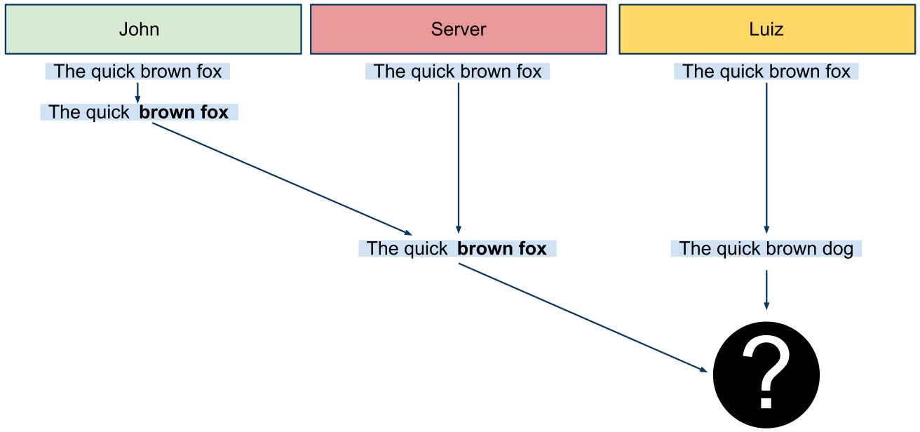 Im Beispiel von Google gibt es John und Luiz. Beide arbeiten gemeinsam an einem Dokument in Google Docs. Ausgehend vom Text "EASY AS 123" sollen nun Updates durchgeführt werden und diese sollen zum Gegenüber synchronisiert werden. Die Zahlen im roten Feld entsprechen je einem Zeichen. Ein Unterstrich stellt das Leerzeichen dar. John's Aktionen werden in hellgrün und Luiz' Aktionen in gelben Boxen dargestellt.